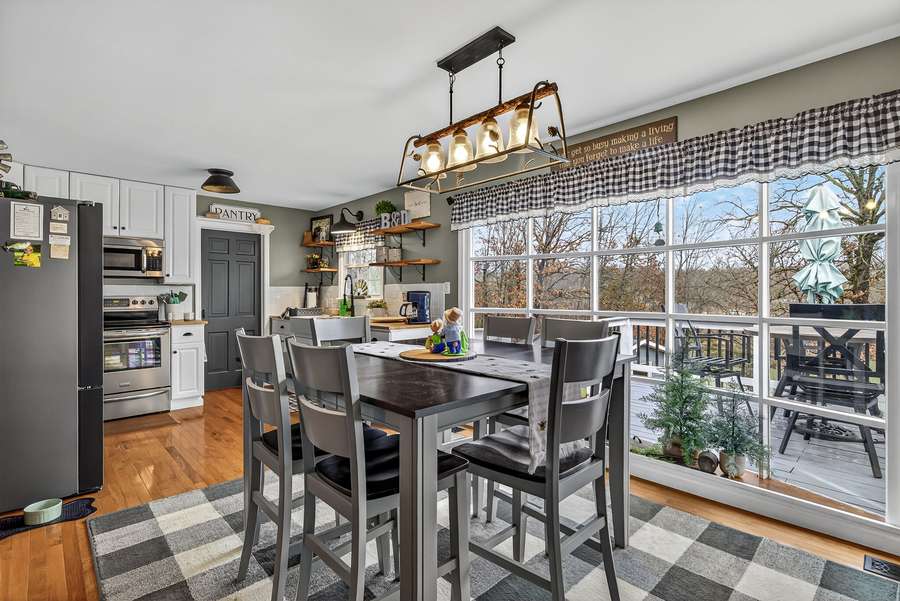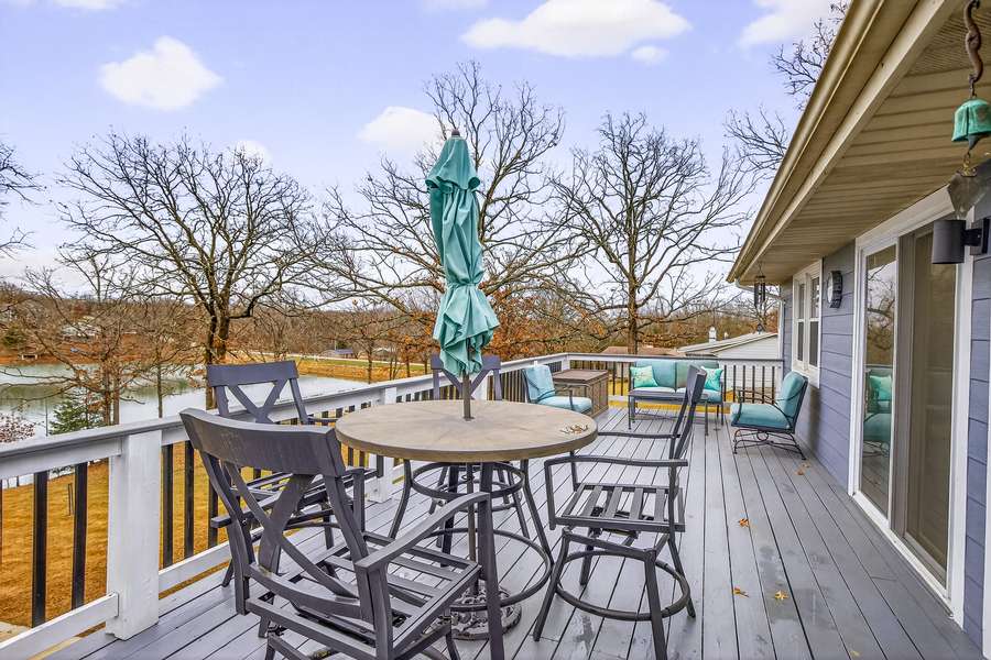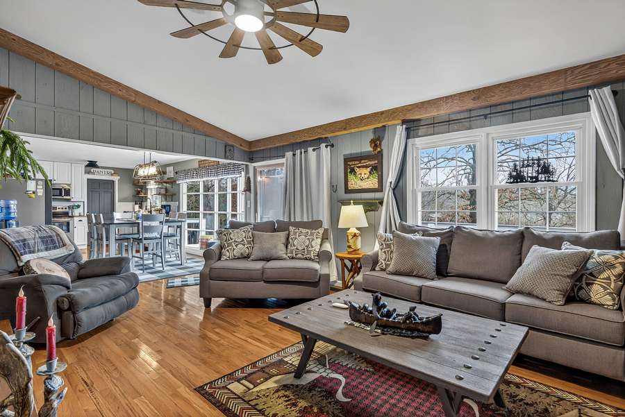 The main floor features a large living room and dining area, a sunlit kitchen with a walk-in pantry, hardwood floors, and large windows that provide a picturesque view from your waterfront oasis. Step onto the huge deck and enjoy your morning coffee or a meal while taking in the abundant wildlife and peaceful lake views.