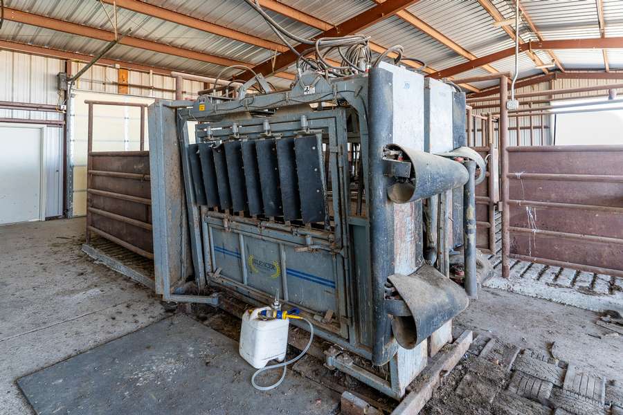The facilities are second to none and well-planned for maximum efficiency. The receiving and loading dock is designed with an alleyway and working lane to safely load or unload cattle as they are directed to or from the sorting pens. The 8,000 sq ft livestock barn houses an open-air covered working area with a platform scale, hydraulic squeeze chute, sick pen, connected sorting pens, and transition pen. This facility also includes a climate-controlled office/storage area along with a bathroom.