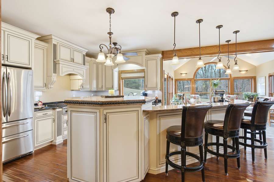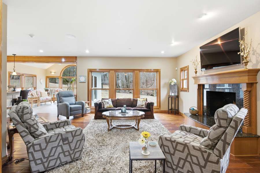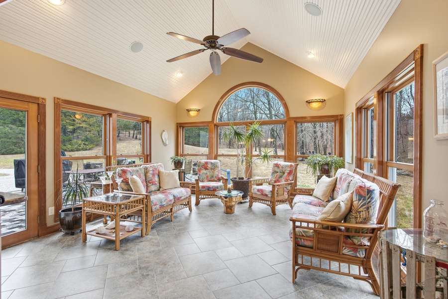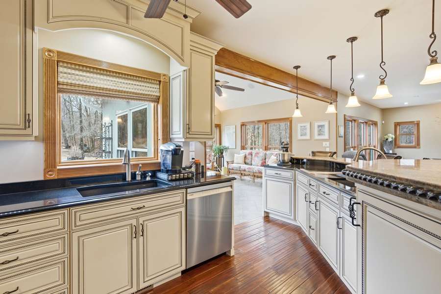 The fantastic kitchen is built for both everyday living and entertaining, featuring a Wolf gas stove, high-end appliances, a hidden pantry, and generous storage space throughout. Just off the main living area, the sunroom provides the perfect place to relax and watch the wildlife, overlooking the incredible scenery this property has to offer.