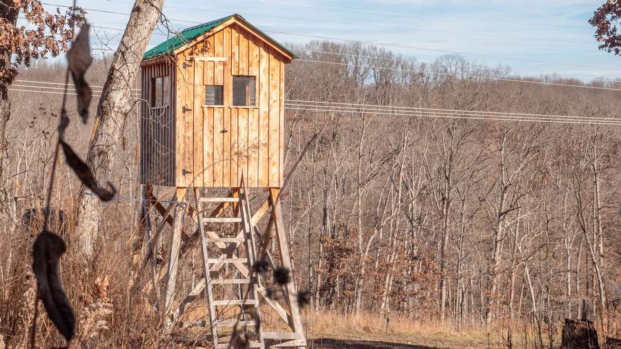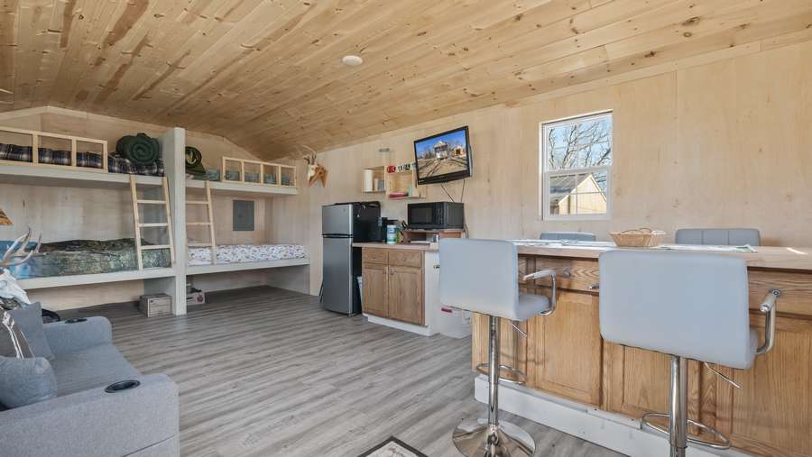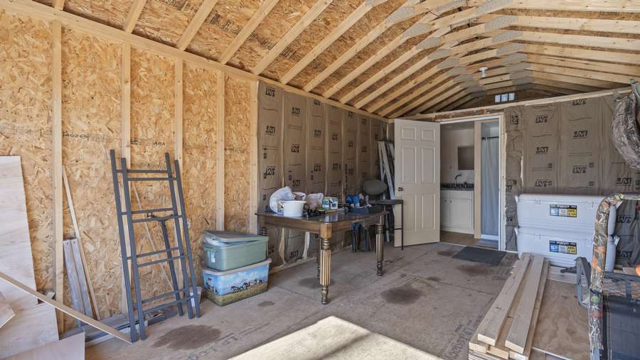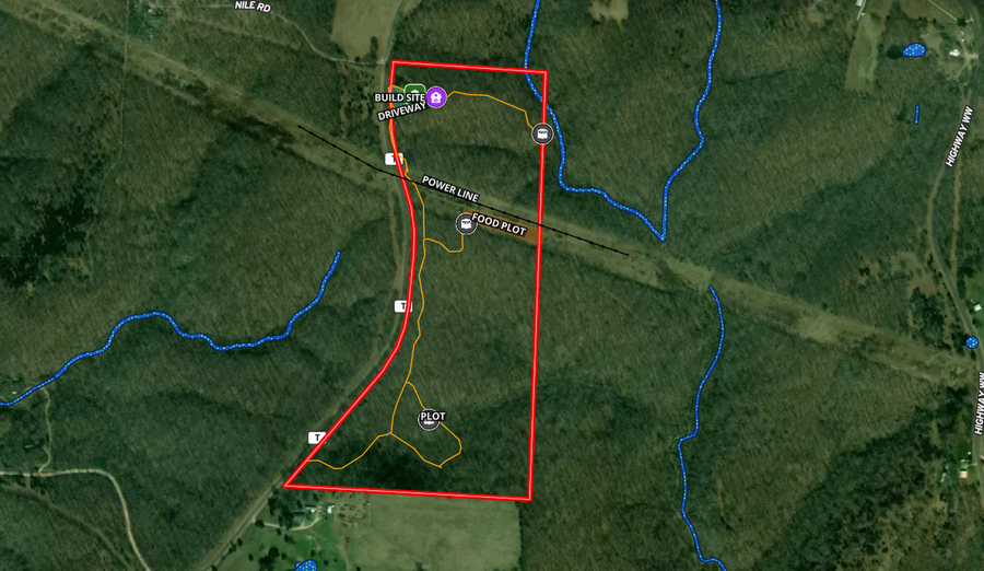 The smaller shed is a 12x24 and was converted into a shower/ bathroom. The larger garage is 20x20 with a 8x8 garage door perfect for storing any equipment you might have. There are several established trails going through the whole property that are easy to navigate, deer stands already in place, small watering hole for the wildlife, and an elevated box blind overlooking the power line clover food plot. This property offers nearly 3/4 of a mile of black top road frontage as well as a nice flat area to pull into.
